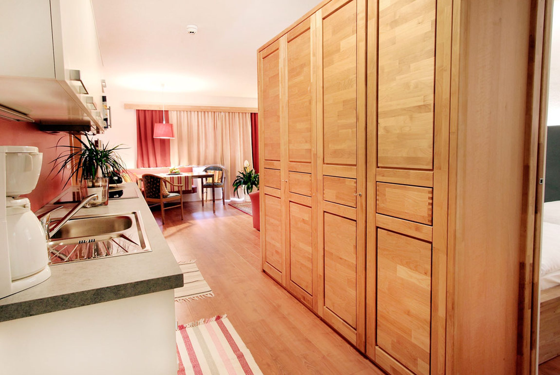Apartman tip A za 4-6 osoba: 49 m2, bračni krevet (klizna vrata), kreveti na kat (klizna vrata), kuh. niša, dnevni prostor sa stolom za jelo + sofa na razvlačenje za 2 osobe.