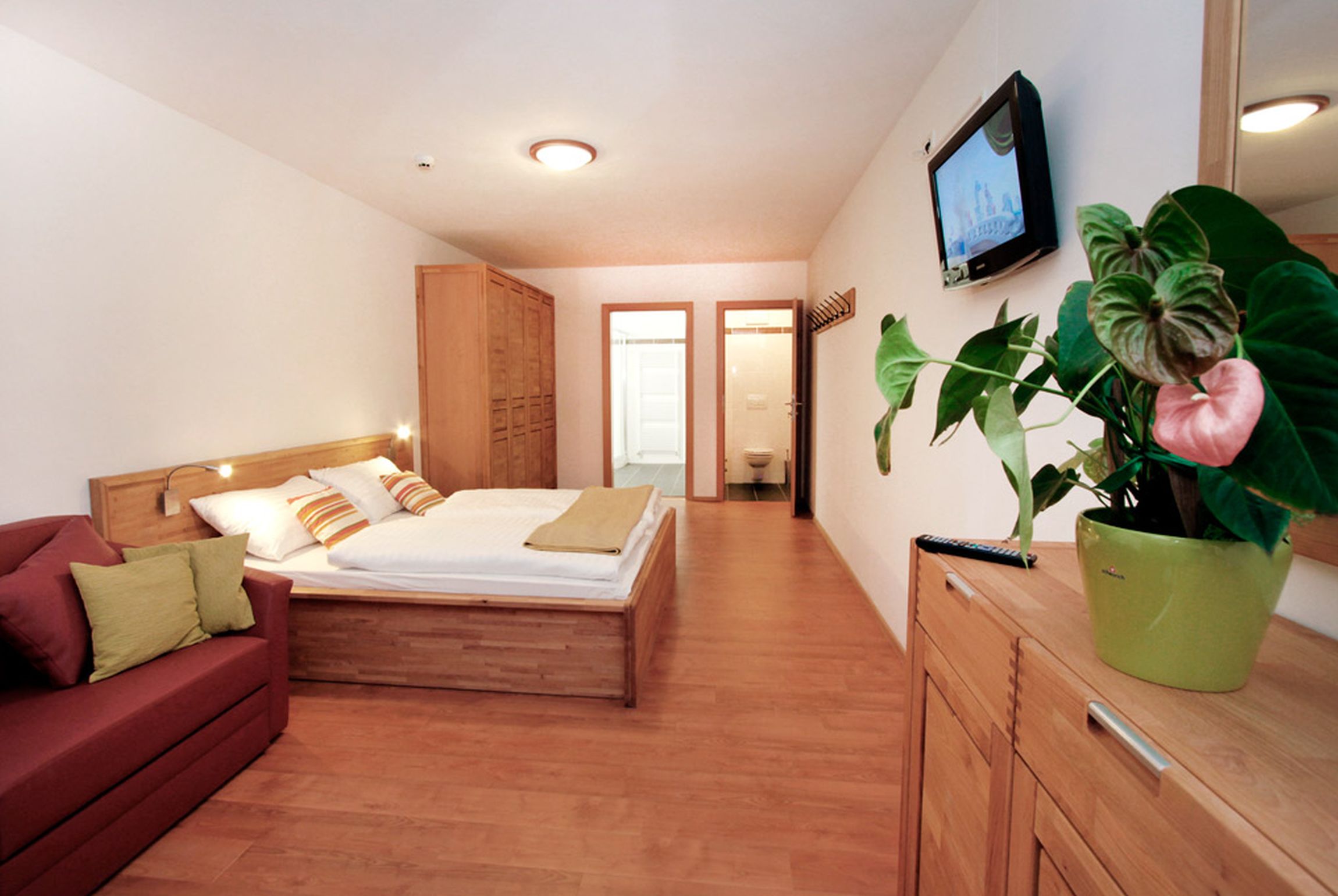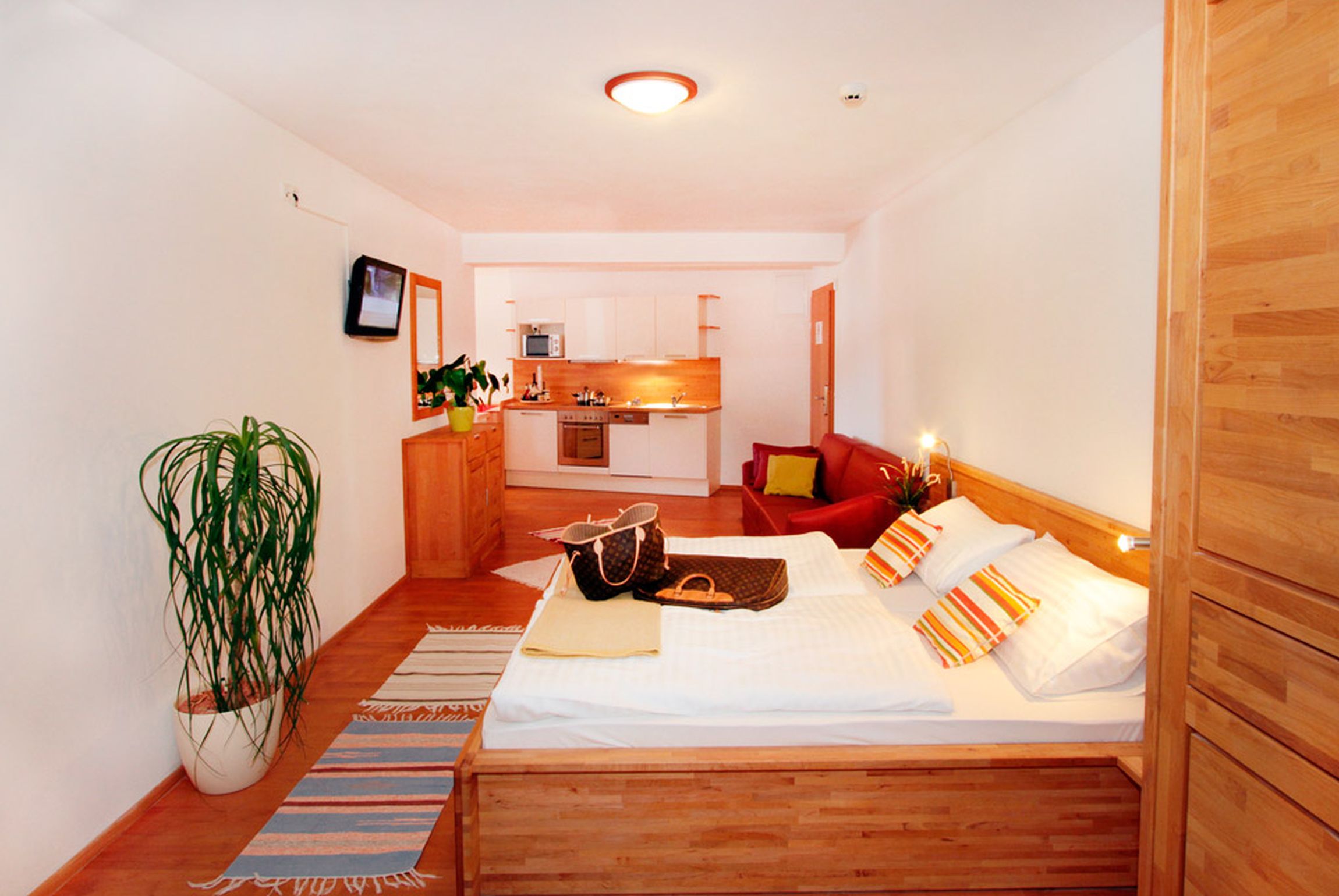 Apartman tip C za 2-4 osobe: 45 m2, bračni krevet (klizna vrata), kuh. niša, dnevni prostor sa stolom za jelo + sofa na razvlačenje za 2 osobe.