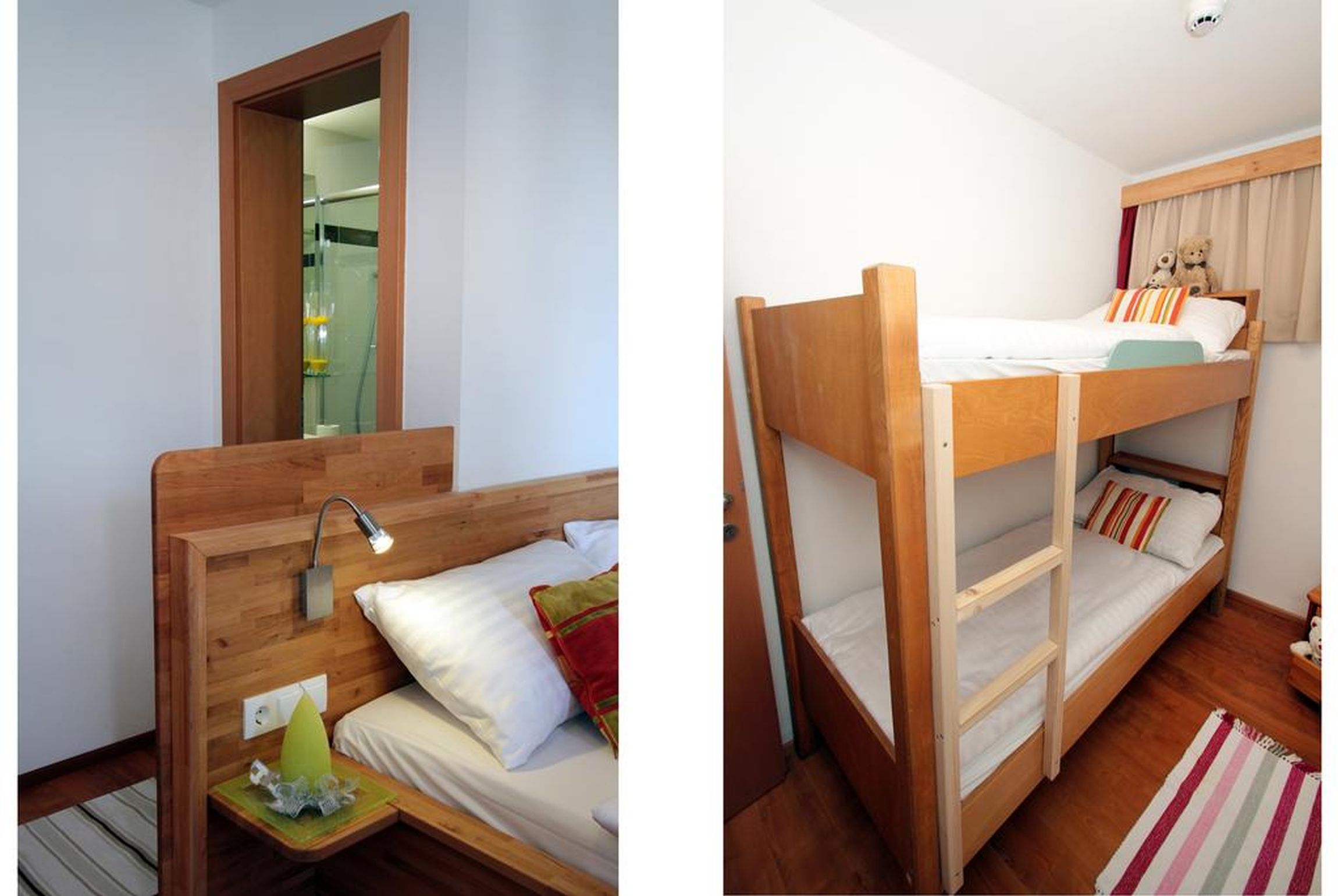 Apartman tip B za 6-8 osoba: 65 m2, jedna spavaća soba s bračnim krevetom i odvojenim WC-om, bračni krevet (klizna vrata), kreveti na kat (klizna vrata), kuh. niša, dnevni prostor sa stolom za jelo + sofa na razvlačenje za 2 osobe.