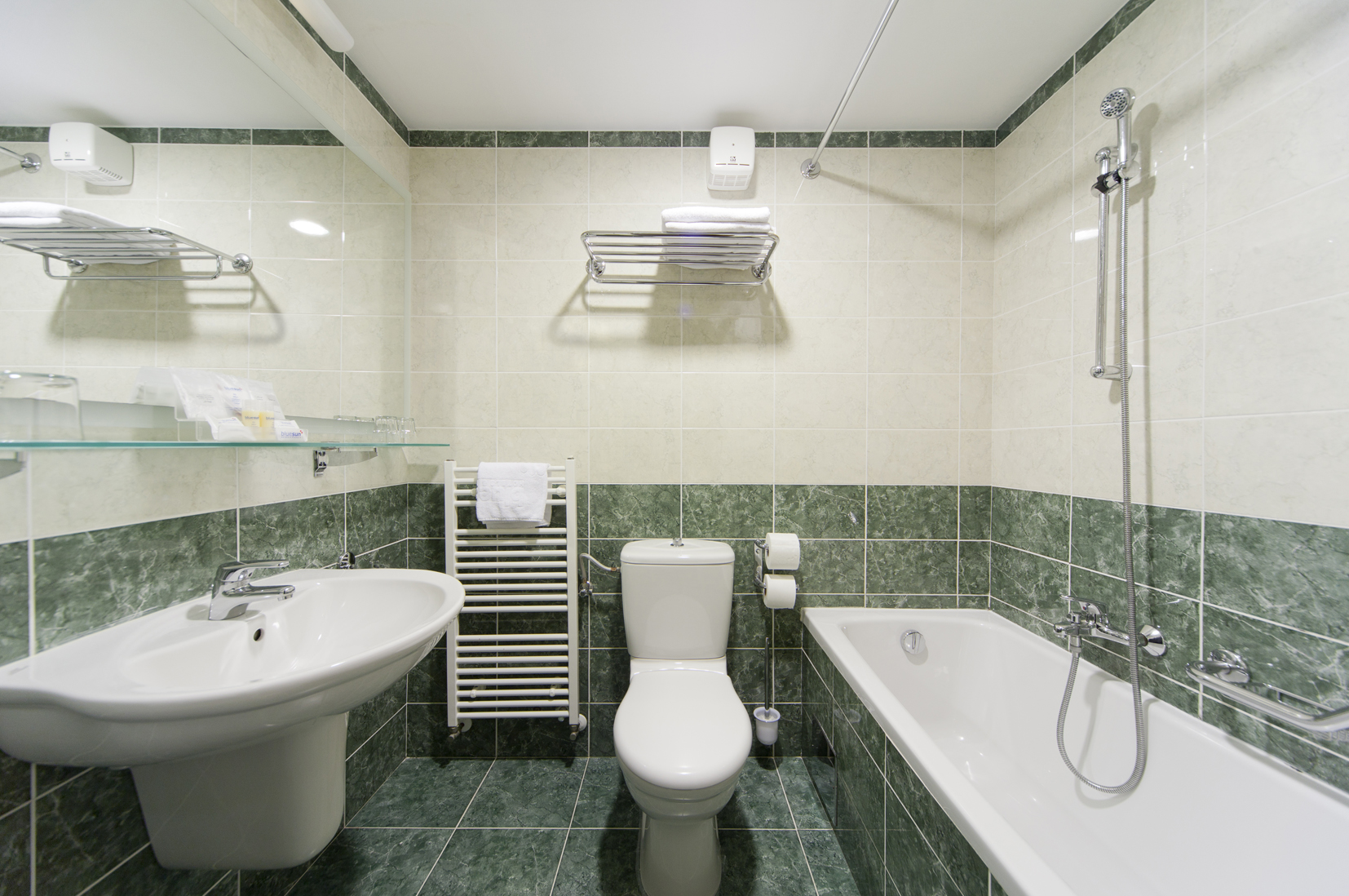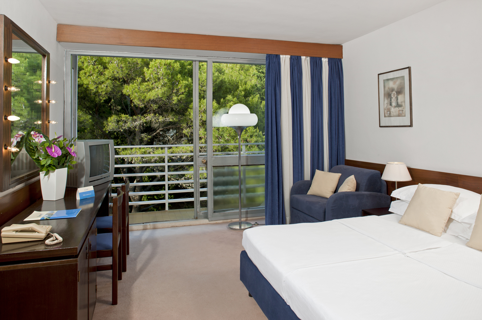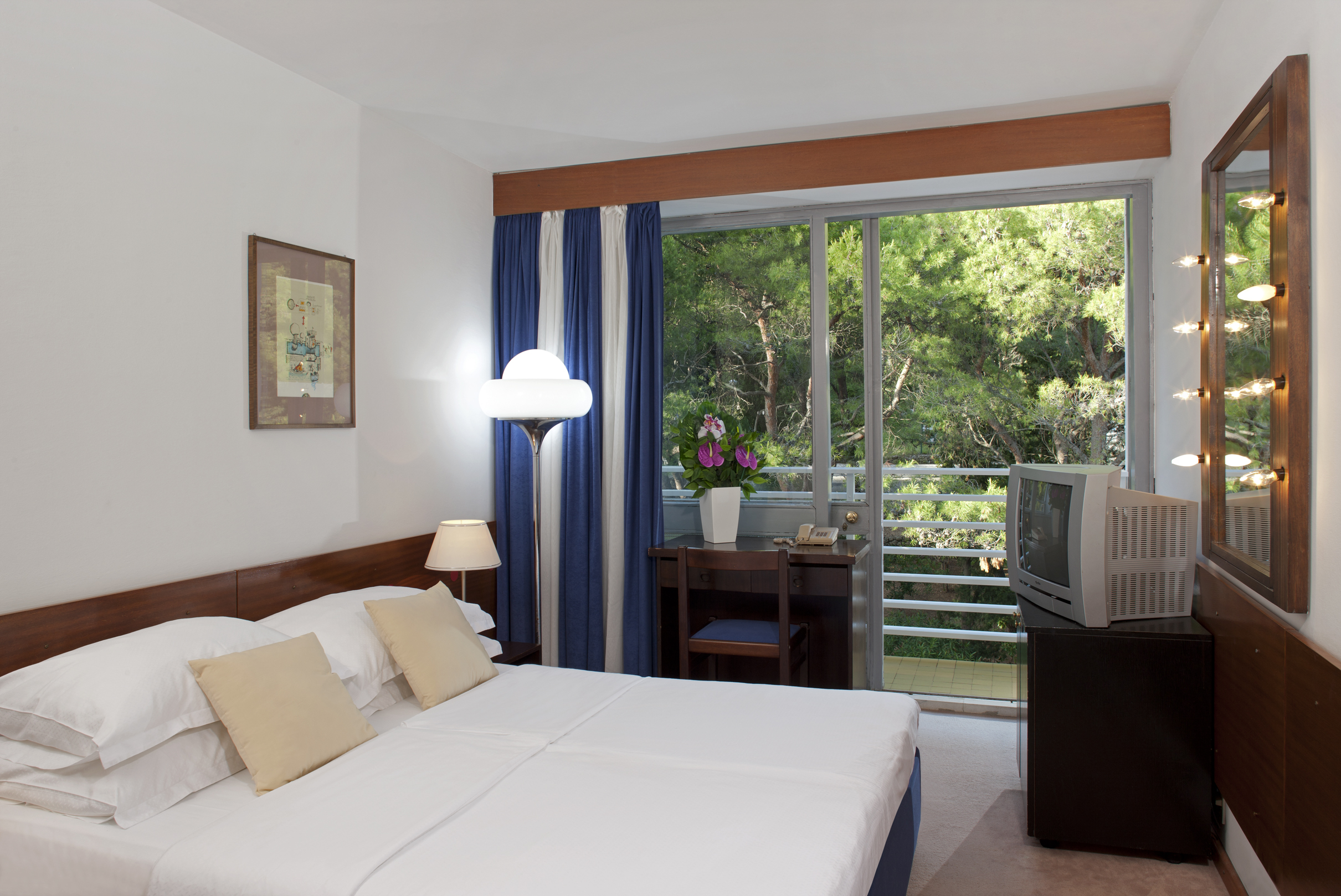 klima uređaj; kada/WC, telefon, SAT TV, sef, mini bar, sušilo za kosu.