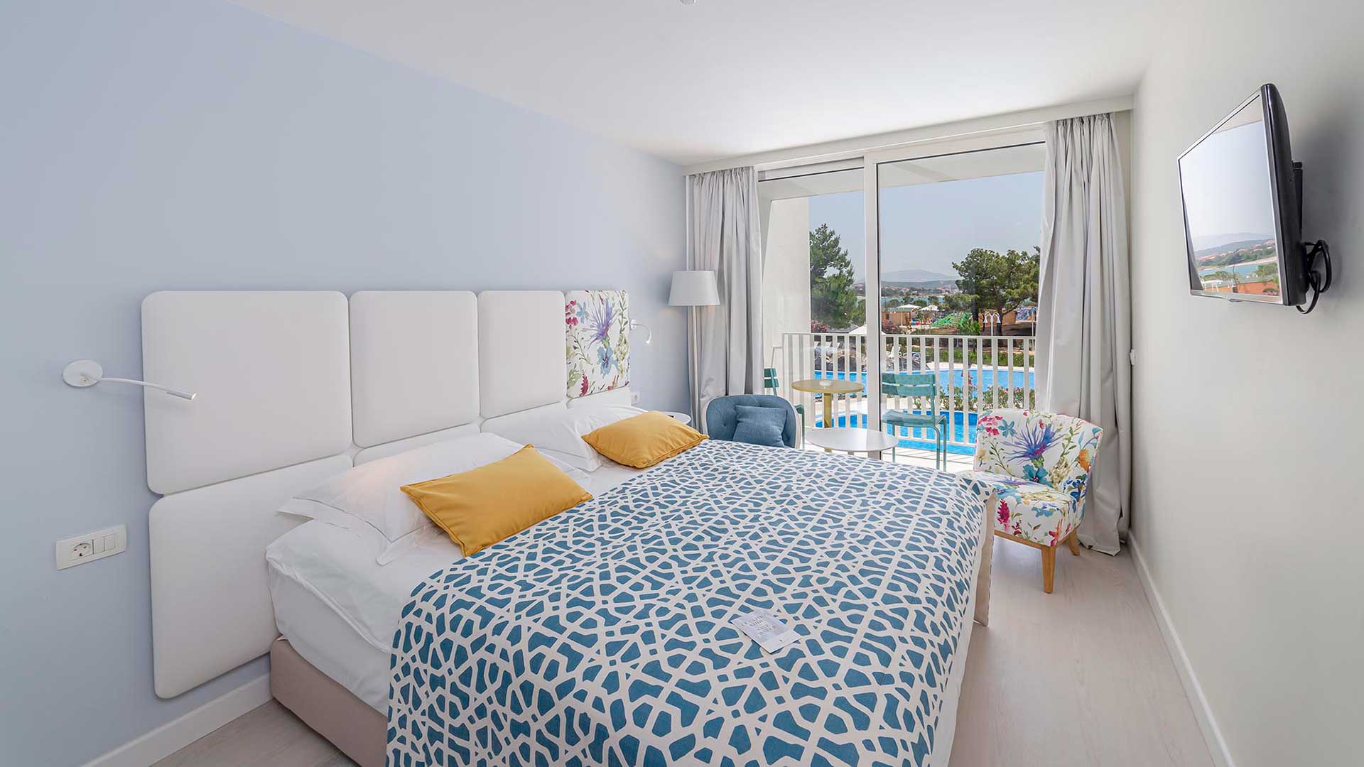 Dvokrevetna soba s krevetom na kat, francuski balkon, atrij (FMAF): bračni ili 2 odvojena ležaja + 2 pomoćna ležaja (krevet na kat pogodan za 2 djece do 11,99 g.), klima uređaj, mini bar, SAT TV, telefon, francuski balkon, min/max 2 odrasle osobe i 1-2 djece do 13,99 g.