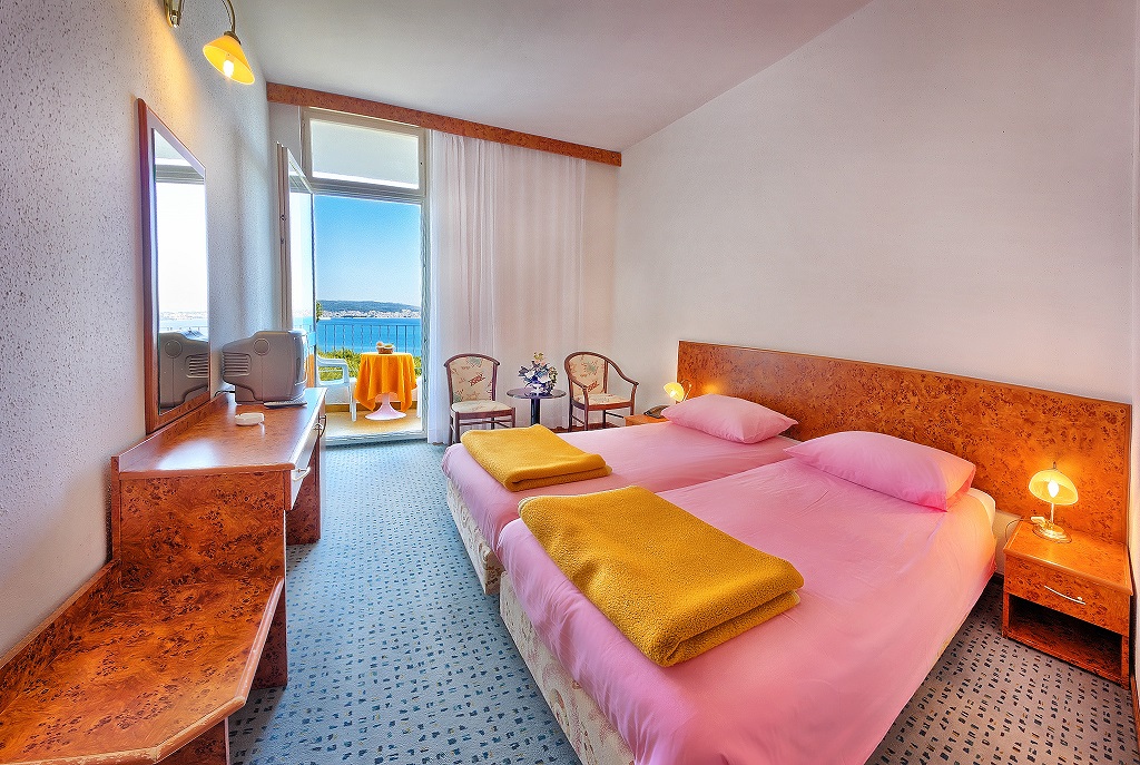 SUPERIOR MORSKA STRANA *** (36 soba: 8 trokrevetnih, 16 dvokrevetnih, 12 jednokrevetnih – 5. kat, zgrada B). Telefon, SAT/TV, klima uređaj, sef, mini hladnjak, sušilo za kosu, kupaonica s kadom, balkon s pogledom na more.