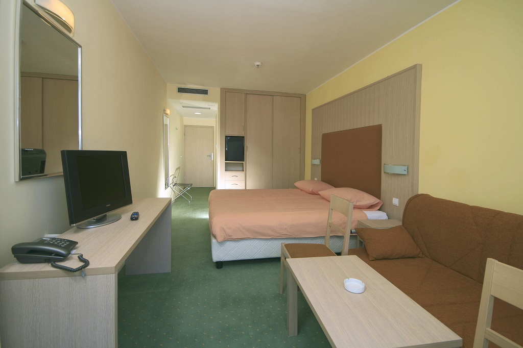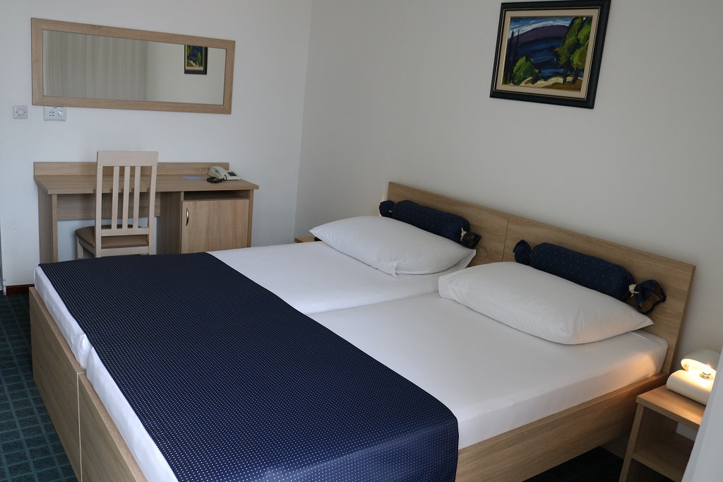 STANDARD PARK *** (56 soba: 28 trokrevetnih, 28 dvokrevetnih – 1. i 2. kat, zgrade B).Telefon, SAT/ TV, klima uređaj, sef, mini hladnjak, sušilo za kosu, kupaonica s kadom, balkon s pogledom na park.