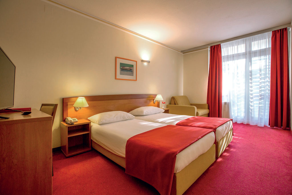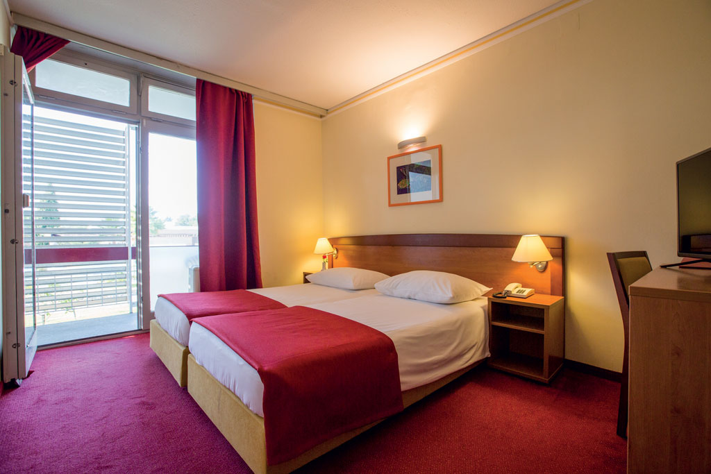 Dvokrevetna soba pogled dvorište/vrt sa balkonom (2CGB): twin kreveti, balkon, centralni klima uređaj, mini bar, SAT TV, telefon, min/max 2 osobe ili 1 odrasla osoba i 1 dijete do 11,99 g.