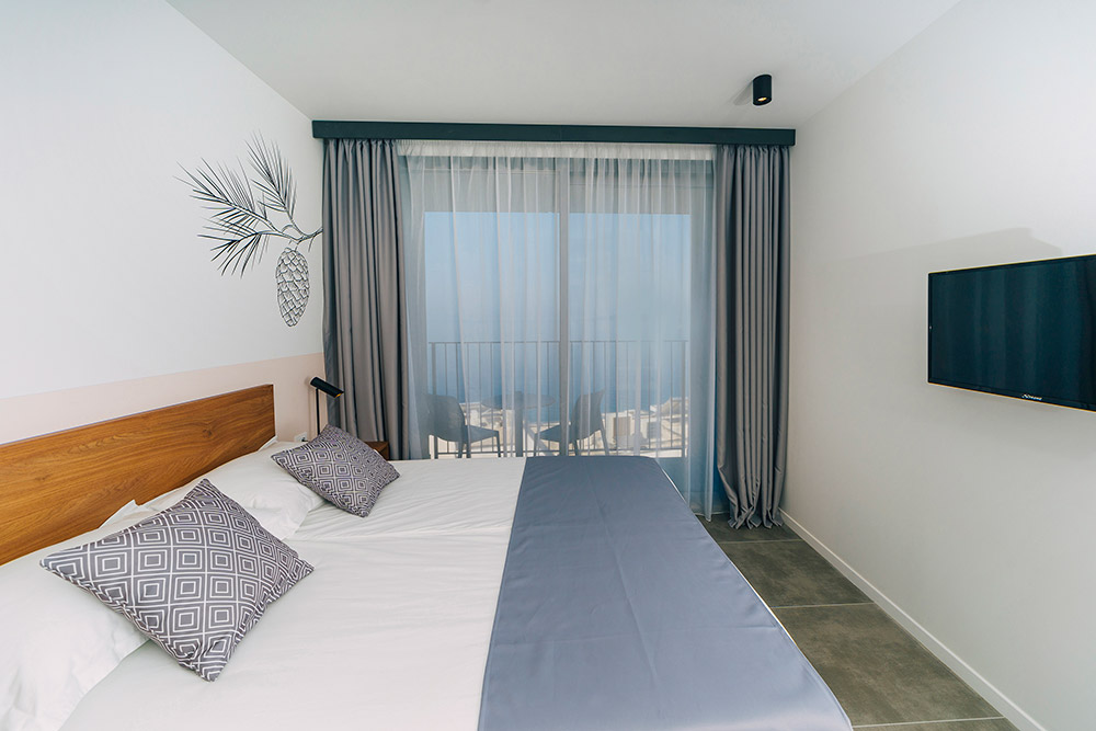 Dvokrevetna comfort soba s pomoćnim ležajem: možete odabrati comfort sobu s pogledom na more, s orijentacijom na morsku stranu ili s pogledom na park stranu za one željne mira i tišine. Krevet može biti bračni ili odvojeni. Kvadratura sobe je 20 m2. Soba sadrži balkon, black out zavjese, klimatizaciju, sef, mini hladnjak, telefon, TV, Wi – Fi, tuš kadu, sušilo za kosu, toalet potrepštine za kupanje.
