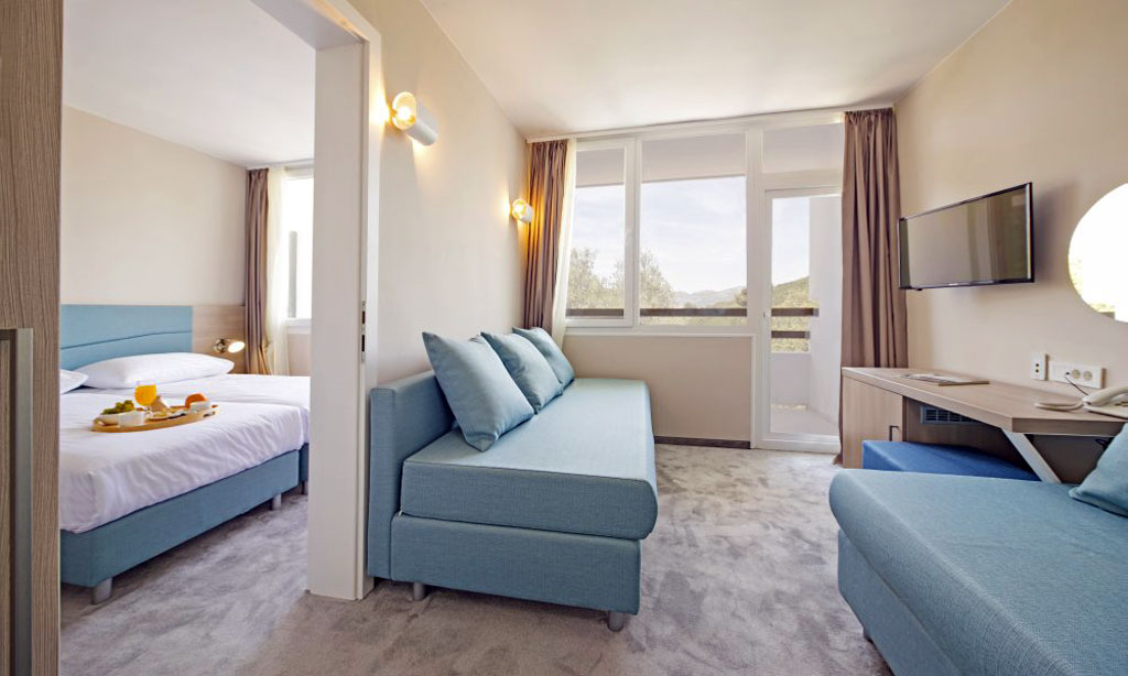 – 56 obiteljskih soba s balkonom ili terasom, veličine 31 – 36 m2, 2 odvojene sobe, kupaonice s kadom za odrasle i posebna kupaonica s tušem za djecu