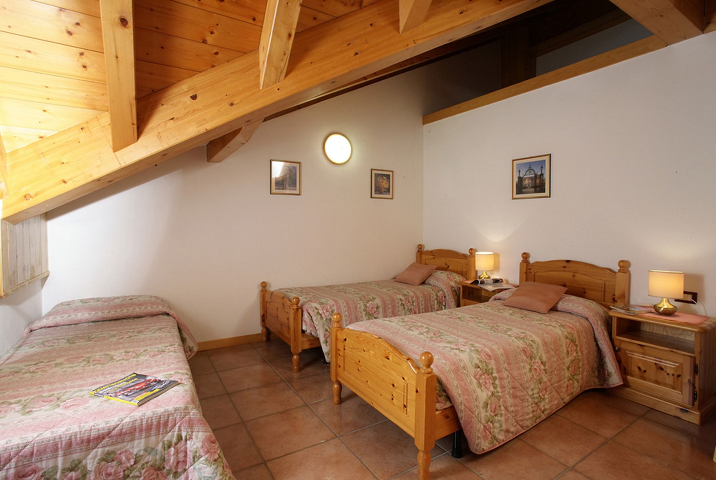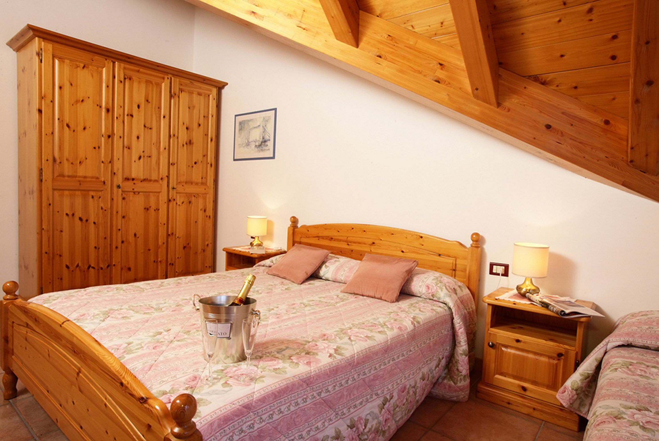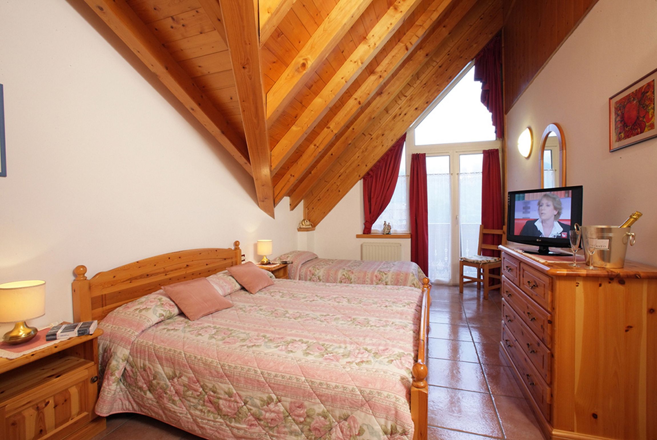 Chalet za 6 osoba na dvije etaže: u prizemlju 2 kupaonice, dnevni boravak s kaminom i sofom, kuhinja, terasa, na gornjoj etaži: dvije spavaće sobe s krevetima na kat, galerija sa sofom, balkon.