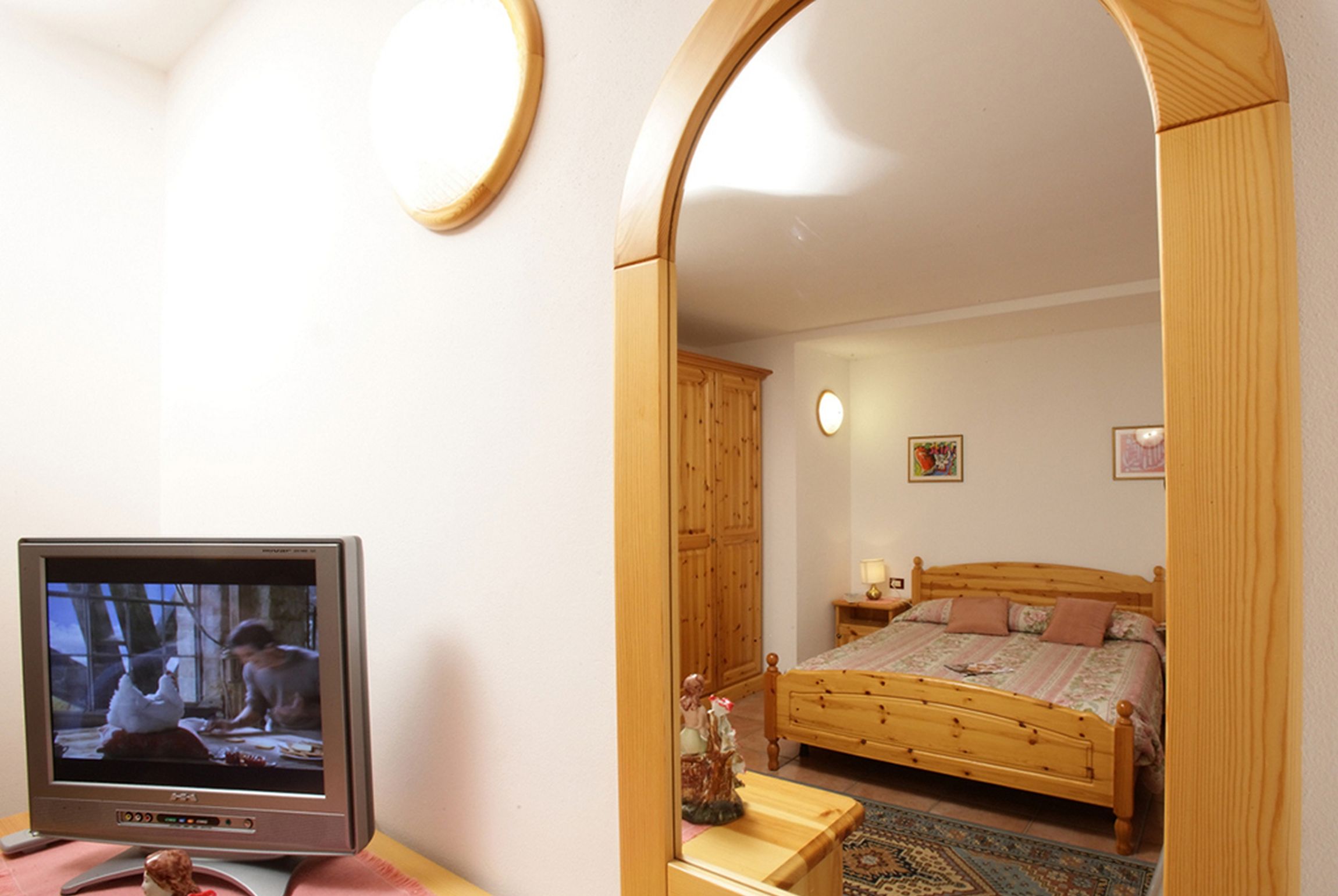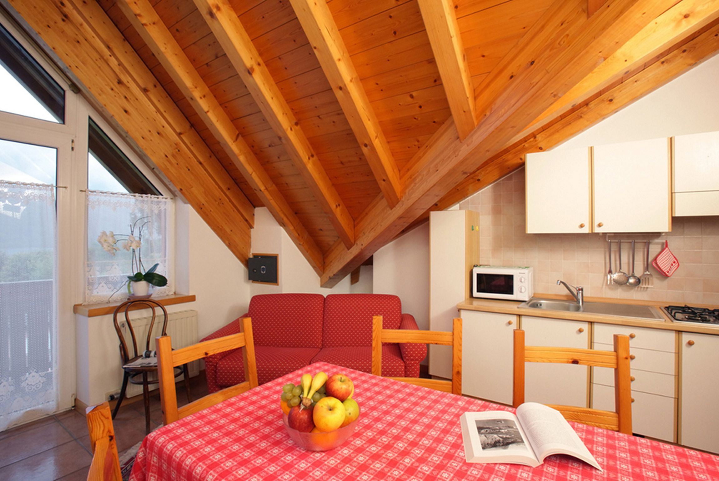 Apartman Typ D za 4-6 osoba na dvije etaže: na gornjoj etaži spavaća soba s bračnim krevetom i spavaća soba s krevetima na kat, u prizemlju: dnevno spavaći prostor sa sofom na razvlačenje za 2 osobe, kuhinja, kupaonica, balkon.