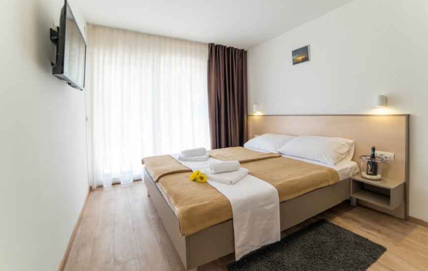 Soba 1/2+1 standard, francuski balkon: 25 m² (maksimalno 3 osobe), 2 kreveta 90 x 200 i fotelja na razvlačenje, kupaonica s tušem, sušilo za kosu, klima uređaj, SAT TV, telefon, mini bar, pogled more