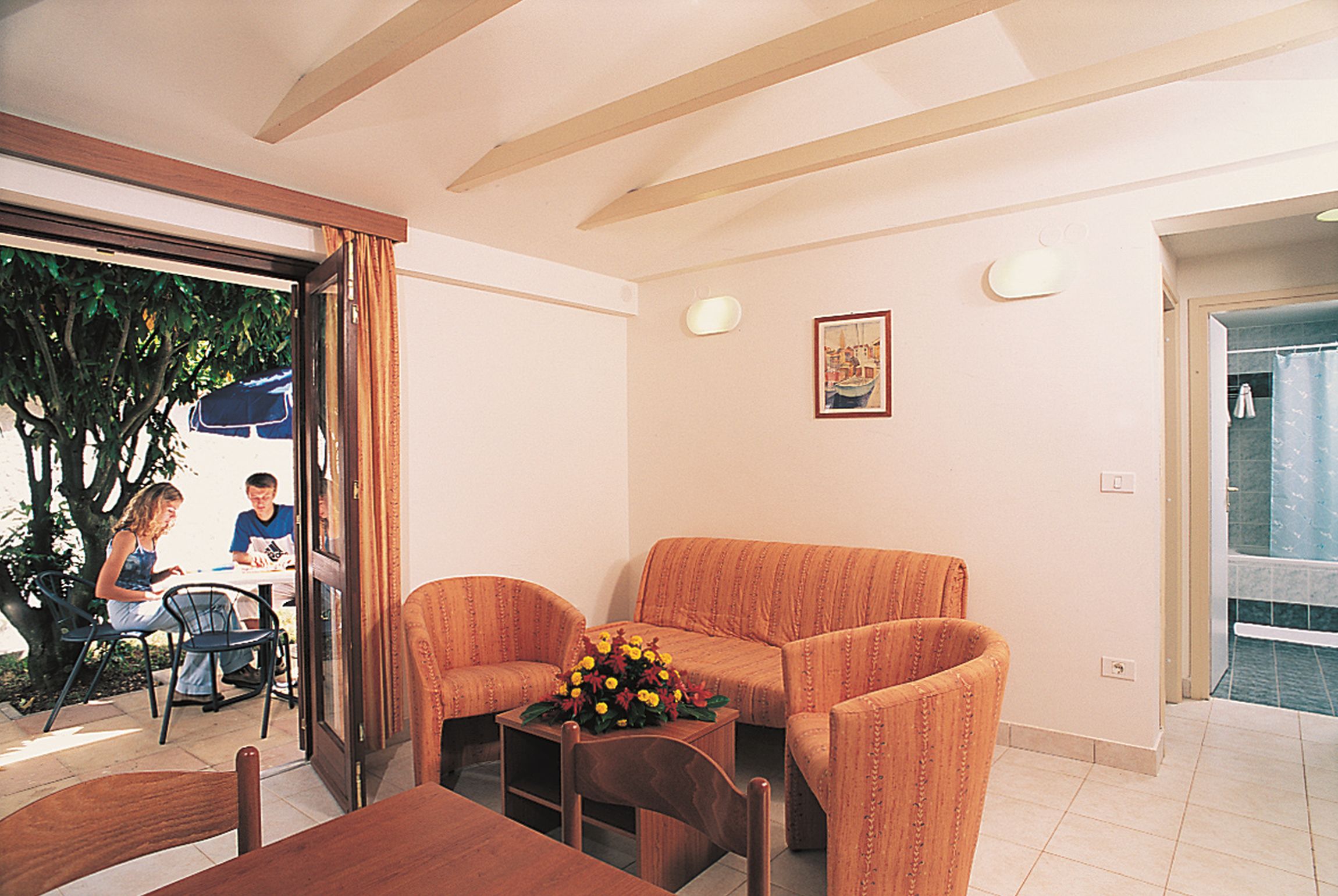 42 m2, kuhinja (ploča za kuhanje, aparat za kavu, hladnjak), kupaonica s kadom, klima-uređaj, terasa ili vrt, sušilo za kosu